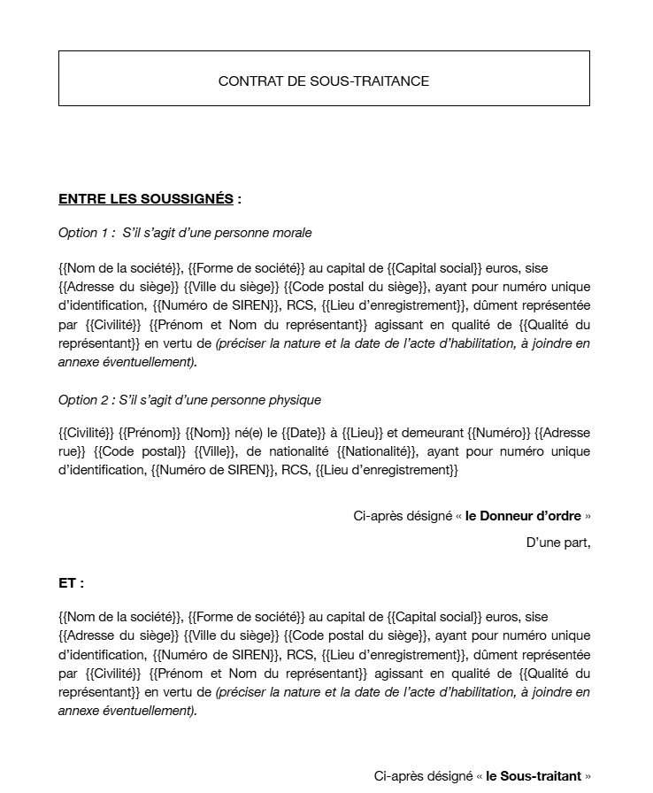 Notre contrat de sous-traitance sert à établir les termes et les conditions de la relation commerciale entre deux parties : l’entrepreneur principal (ou donneur d’ordre) et le sous-traitant.
