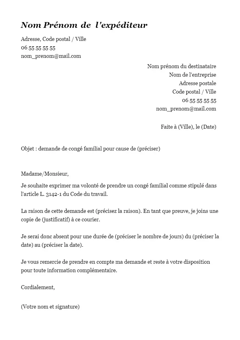 Assurez vous d’adapter notre modèle à votre situation personnelle en remplissant les informations entre crochets avec vos propres détails. De plus, veillez à consulter la politique de congé de votre entreprise pour vous assurer de respecter les procédures spécifiques et les délais de préavis requis.